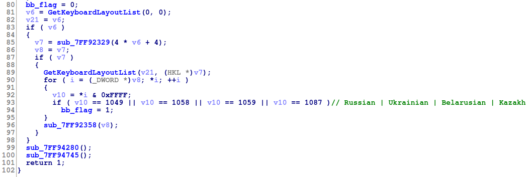 Digging a bit in the code we can see that this new parameter is a flag specifying if the infected system uses a "friendly" keyboard layout (bb_flag = 1). The list of cool countries considered friends by Andromeda are: Russia, Ukraine, Belarus and Kazakhstan.