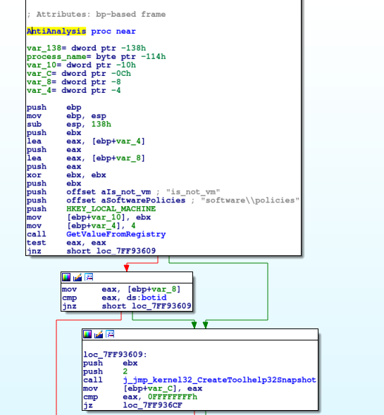 The old Andromeda versions used to include a nice bypass of the anti-analysis routine. If the CRC32 checksum of the system drive volume name was 0x20C7DD84 then the bot was executing correctly even if it was running in a virtual environment. The latest version has removed this bypass but it includes a different one. It is a bit more annoying to set it up, but not really difficult.