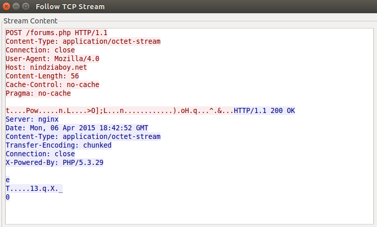 I was talking above about the request format used to send the different parameters to the control panel. This POST request is encrypted with the RC4 key and used to be encoded with Base64. However, this latest version of Andromeda skips the Base64 encoding and sends the data directly. It also changes the Content-Type header from the usual “application/x-www-form-urlencoded” to “application/octet-stream”. Fortunately for the lovers of SNORT rules, it keeps using the same User-Agent, “Mozilla/4.0”. This is an example of a random sample: