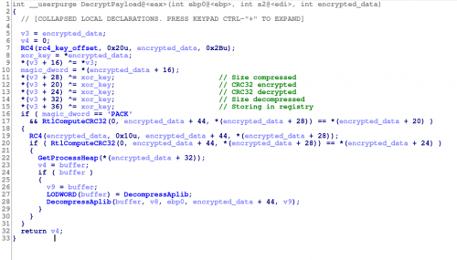 When the previous Andromeda versions (<=2.09) were installing plugins from a given URL, the bot was decrypting them skipping certain bytes as header and using the RC4 key to decrypt the data from a specific offset. After that aPLib was used to decompress the final DLL. In the latest version the process to decrypt the plugins is slightly more complex: