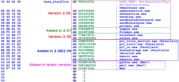 As you can see, the version 2.09 includes the same hashes as the version 2.08, but the latest version adds python.exe, perl.exe and another mysterious process to the black list. It would be nice if someone could uncover this missing process. Challenge: CRC32(lower($process)) = 0x3044F7D4; $process = ???