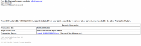 ZeuS P2P distribution campaign: ACH transaction canceled