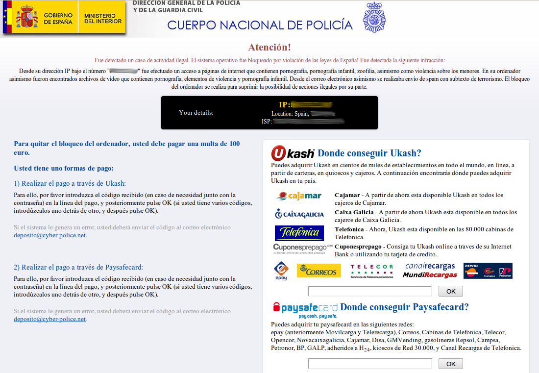 This was an interesting situation so I tried to help my friend. In this case, just after the desktop appeared, a full-screen window showed. It was a warning from the Spanish police ("Cuerpo Nacional de Policía") saying that the system had been blocked because it had been used to perpetrate illegal actions like child pornography, terrorism and violence against children: "Fue detectado un caso de actividad ilegal. El sistema operativo fue bloqueado por violación de las leyes de España!". A warning like this can be shocking for a normal user, so social engineering was working here. However, this warning was also asking for 100€ to be paid via Ukash or Paysafecard as a fine for this behaviour and in order to restore the system. This part can be a bit strange and maybe makes the victims call the police very quickly. Once this window appeared no other action was possible, like execute the Task Manager or return to the desktop, just enter a code to pay.