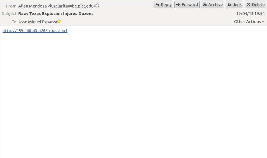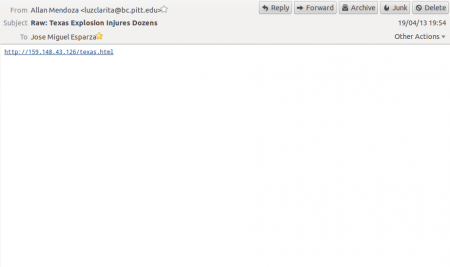 Un día después de recibir estos correos ya tenía en mi buzón otros más actuales hablando de la explosión de la planta de Texas, usando exactemente la misma plantilla de correo y demás características: