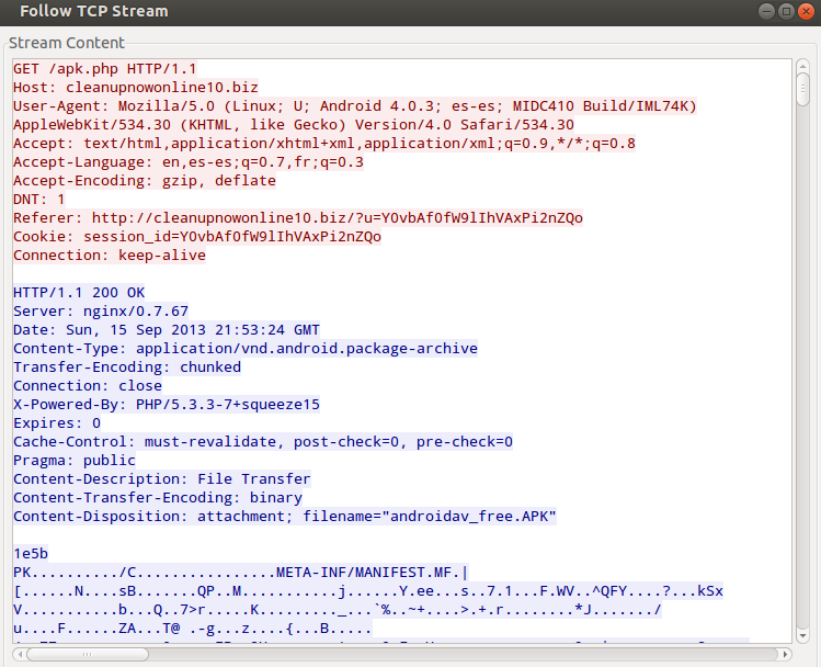 Echando un vistazo al script se puede ver rápidamente que es el culpable de mostrar al usuario la página que anuncia que su dispositivo está infectado (primera imagen), para posteriormente realizar una petición a la siguiente URL para descargarse la aplicación: