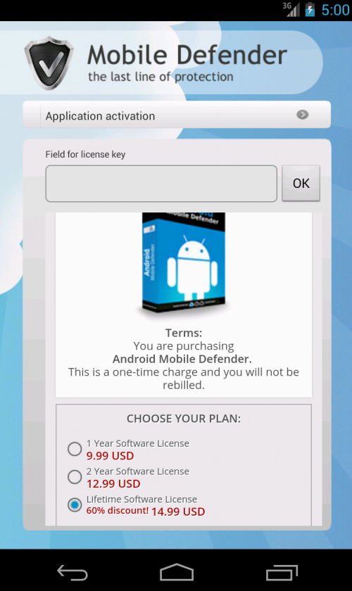 Al instalarse la aplicación nos encontramos con Mobile Defender, una bonita rogue app, que intenta asustar a los usuarios para que compren la versión “pro”, con licencia de por vida, por menos de 15$! Una ganga, vamos...;p