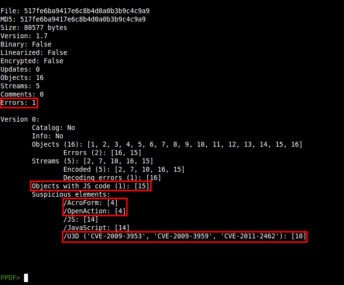 I've highlighted the interesting information of the info command: one error while parsing the document, one object (15) containing Javascript code, one object (4) containing two ways of executing elements (/AcroForm, /OpenAction) and one U3D object (10), suspicious for its known vulnerabilities, apart of the latest one.