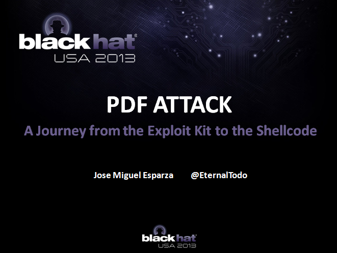 BlackHat USA 2013 ya está aquí y mañana estaré explicando cómo analizar exploit kits y documentos PDF en mi workshop “PDF Attack: From the Exploit Kit to the Shellcode” de 14:15 a 16:30 en la sala Florentine. Será una sesión práctica, así que traed vuestros portátiles y esperad algunos ejercicios para jugar ;) Sólo necesitáis una distribución Linux con pylibemu y PyV8 instalado para apuntarte a la fiesta. También se pueden seguir los ejercicios e instalar todo en Windows si se prefiere...