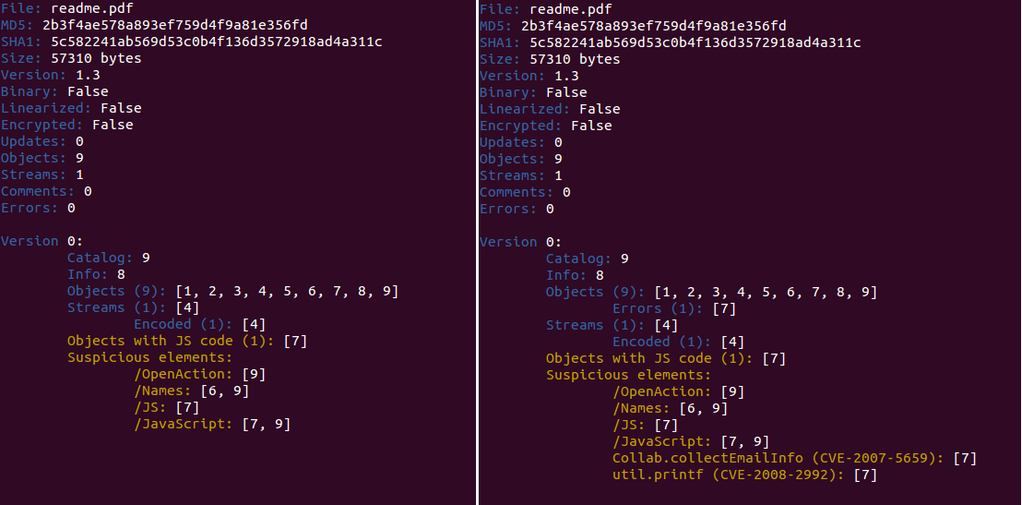 - Soporte para AES en el proceso de descifrado: Hasta ahora peepdf soportaba RC4 como algoritmo de descifrado, pero AES estaba en el TODO debido a las diferentes muestras que usaban este algoritmo para ocultar contenido malicioso. Según me comentaron en Las Vegas parece que habrá próximas modificaciones en la especificación PDF en este aspecto, por lo que es posible que haya más cambios en un futuro cercano.