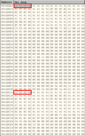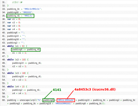 Instead of showing an access violation the CALL function is pointing to a valid address in icucnv36.dll, 0x4A8453C3. This address is not random and it's used in the Javascript code to perform part of the heap spraying: