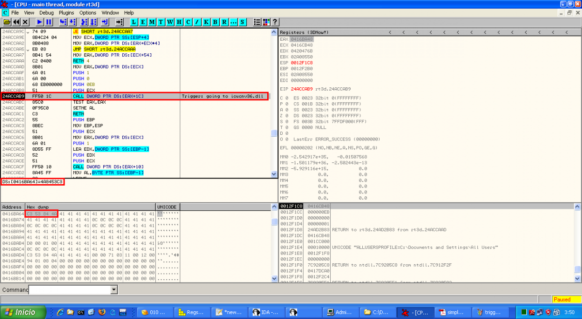 After the exploit static analysis some things like the function of the shellcode were unclear, so a dynamic analysis could throw some light on it. When we open the exploit without the Javascript code used for heap spraying we obtain an access violation error in rt3d.dll. If we put a breakpoint in the same point when we launch the original exploit we can see this ( better explanation of the vulnerability):