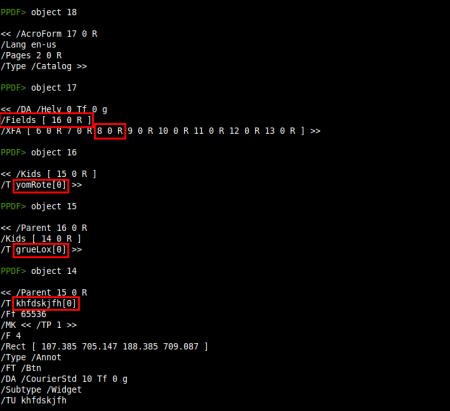 So we have several objects to explore, let's start from the /AcroForm element (object 4):