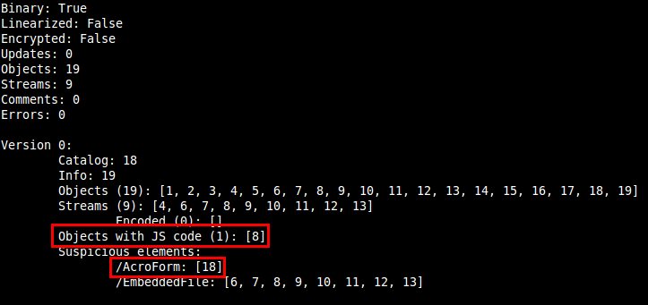 In a quick look we can see that there are Javascript code in object 8 and that the element /AcroForm is probably used to execute something when the document is opened. The next step is to explore these objects and find out what will be executed: